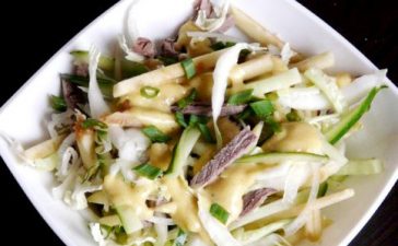 Ингредиенты Говядина 300 гр. Пекинская капуста 1 кочан Огурец 2 шт. Яблоки кисло-сладкие 1 шт. Лук 1 шт. Масло оливковое...