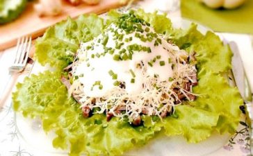 Ингредиенты филе говядины 200 г маринованные грибы 100 г яблоко 1 шт. сыр 100 г майонез 100 гр. листья салата...